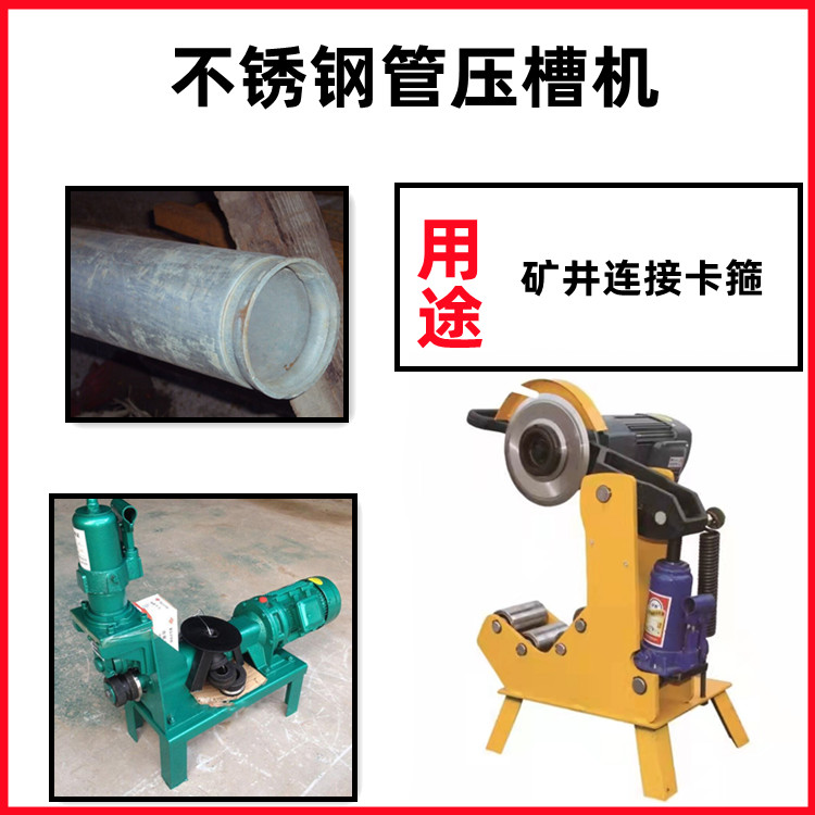 压槽机压槽机是在运用沟槽接头作为管道连接件时,对管子进行予处理的专用工具。作业原理是利滚动的凹压轮带动管子滚动, 凸压轮在油缸效果下渐渐向管子加压,然后构成所需的凹槽,以备按装时运用。可用于消防、自来水、矿井等管道的装置运用说明:1、依据钢管直径,选取托轮或辅佐底架安放钢管。?2、调理主机高度和后支架高度,使钢管处于水平,要求钢管与托轮全长度触摸。3、发动电机。4、扳动油泵)压杆,刀片切入钢管时恰当加大进刀力度,待切入管子后进刀要平稳,在切断前